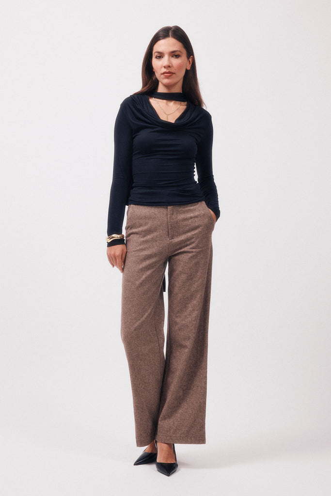 A black top with a fluid fall, designed to accompany both workdays and dressier evenings. Its draped neckline is extended by an integrated scarf that can be tied or let fall freely as desired.