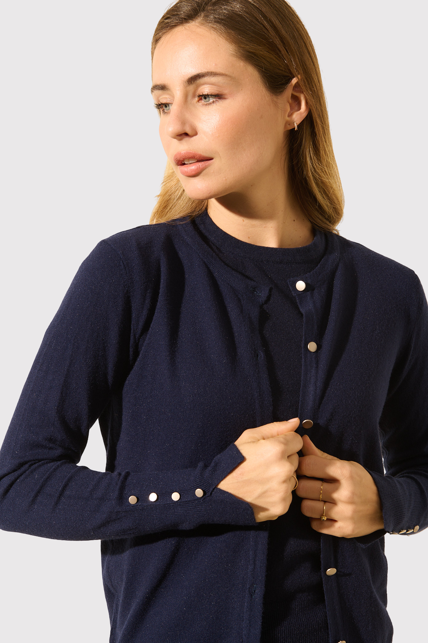Clara is 1m70 tall, wears a size 36 Lorenzo cardigan in one size.