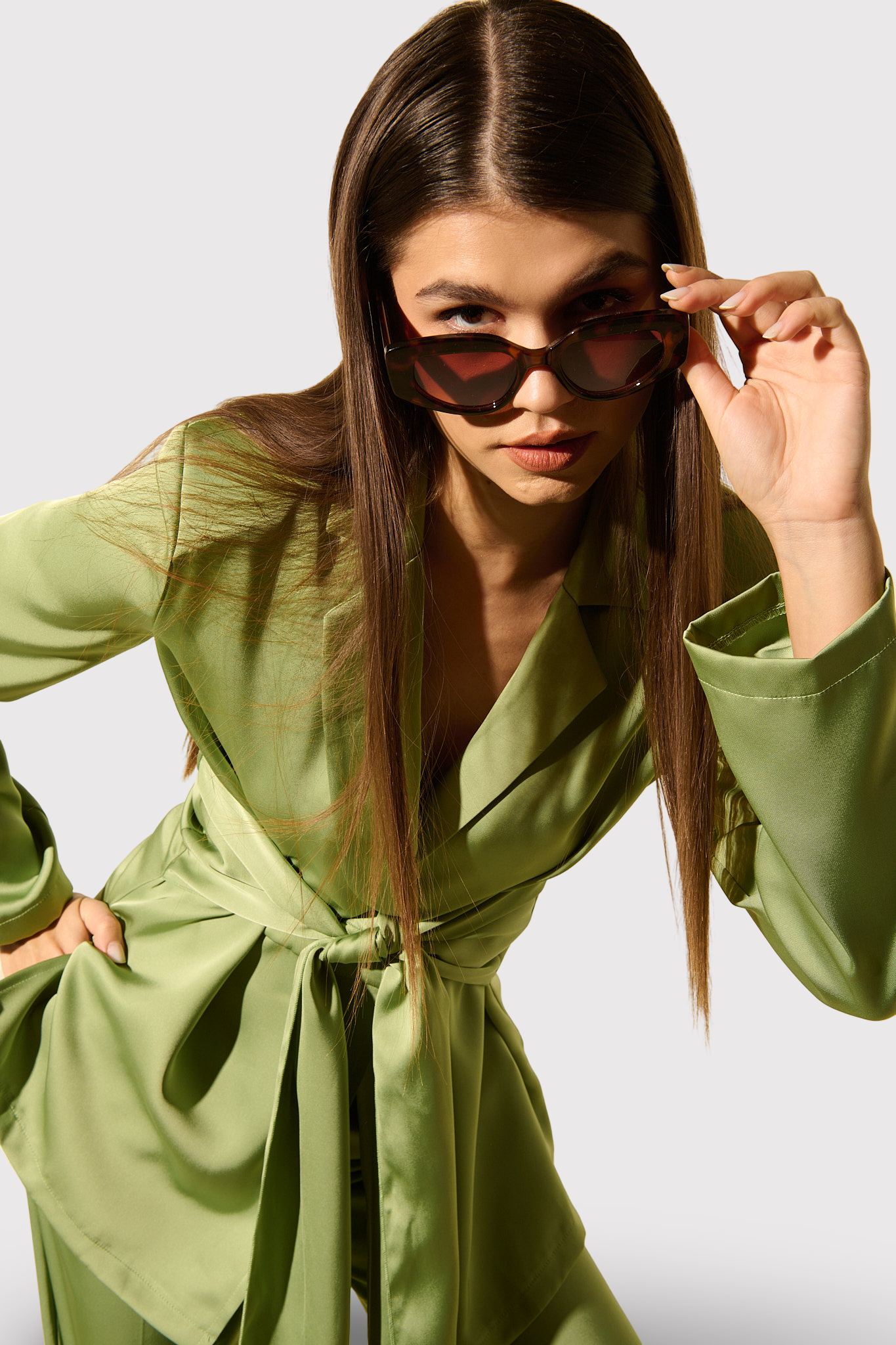 We're revisiting the timeless suit jacket for the season! Fluid, satiny fabric and epaulets accentuate the structured cut. The belt can be tied at the front or back, as you wish.